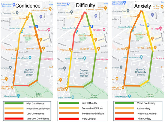 No other study has looked at confidence, anxiety, and difficulty levels around a walkaround with different streetscapes. The results from this study showed that there was commonality between areas that people found more difficult and where they were less confident. This inverse correlation would be expected as when the area is ‘fraught with dangers’ or ‘hostile’ [13,14], it will likely reduce the person’s confidence. Confidence levels were low on Botanic Avenue (points 1–2) due to the busy road, street clutter, crowds of students, street cafes, and food delivery bikes/motorbikes on pavements—it is a street that has a lot of sensory overload. The Botanic Gardens (points 4–5) were also an area with poor confidence due to the unstructured nature of paths, crowds, skateboards, bikes and scooters, changes of light levels due to overhanging trees, and issues with the gates without clearly marked exits. It was expected that points 6–7 would be easier to navigate due to its wide pavements with little street clutter; however, many found it very difficult due to bollards and cobblestones. In addition, people with white canes had extra difficulty due to paving flags causing the cane to ‘stab [them] in the stomach’ constantly. The difficulty increased from points 7 to 8 where there were small paving flagstones, tree roots, more bollards, especially random single bollards, and street crossings without lights. Anxiety was higher around the end of the walk, which is interesting as participants found the earlier areas more difficult with low confidence. This might be explained by the fact that ‘Shaftesbury Square’ is located at the end of the walk and is a very busy and loud traffic area, which feels more exposed to traffic and is very dark due to tree cover. This area is also prone to having ‘unexpected’ obstacles such as litter, skips, and work signs. It should be noted that many participants also stated, ‘if you weren’t here, I would be more anxious’. This could account for the lower anxiety scores, generally.