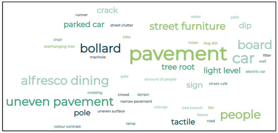 Many participants felt that bright markings would be helpful in streetscapes. These yellow lines are used within streetscapes and stairs as a warning for people with sight loss. Despite this, it is not consistent throughout streetscapes and is often only used in areas such as train stations and platforms. Other barriers mentioned such as pavement issues, bollards, parked cars, uneven pavements, alfresco dining, light levels, and street features such as tree roots, poles, A-boards, and street clutter are mirrored in the literature [18,19,20]. In addition to the literature, one of the study participants became ‘trapped’ in a large open park due to a poor path and exit line up. This shows the importance of access to routes in and out of public spaces. In this case, the exit is a space of one doorway for large crowds and is not obvious. There are also other hazards around the area, including a sculpture with trip hazards and a café/coffee cart. While many of the obstacles reflect the literature, it is interesting that one participant stated that there are so many potential hazards that they are missing them in areas of their vision when they are looking at and for others.
