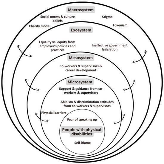 This study delves into the employment experiences of people with physical disabilities in Vietnam to identify ways to improve employment conditions and promote workplace equality. The results from this study reveal a range of accessibility issues, negative attitudes, and discrimination toward employees with physical disabilities. The majority of the participants had received minimal support in areas such as training, career development, and social connections. By applying Bronfenbrenner’s ecological systems theory [47] to the findings, multi-system factors can be identified that influence the employment experiences of people with physical disabilities in Vietnam (see Figure 1).