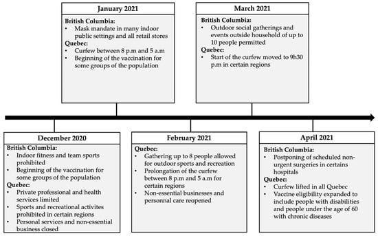 Timeline of the COVID-19 public measures in Quebec and British Columbia.