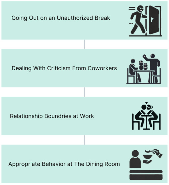 In accordance with [48] recommendation to simplify tools relative to the information processing abilities of people with IDD, the content of the video clips was prepared in consultation with a focus group of eight professionals experienced in working with individuals with IDD. The group included two video modeling specialists and six staff members from sheltered and supported employment programs, comprising managers, coordinators, and counselors. These professionals identified the selected topics as common socio-occupational challenges frequently observed among individuals with IDD in vocational settings. Specifically, they emphasized difficulties such as delaying gratification, coping with mistakes, communicating with employers and colleagues, and self-advocacy as significant barriers to sustained employment for this population. The video clips were then developed based on cognitive-linguistic recommendations for simple language and expressions familiar to people with IDD, including speaking at a suitable pace, filming in a natural and familiar work environment, and reducing visual and cognitive overload [43,52,53]. The topics recorded are presented in Figure 2.