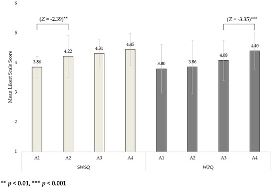 Differences in the SVSQ and WPQ measures between time points as measured using the Wilcoxon Signed Ranks test. Bars represent means with standard deviations (SDs).
