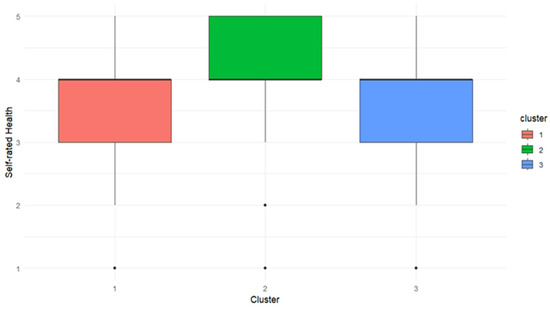 Self-rated health (Figure 2) showed highly significant differences between clusters (F(2,768) = 21.32, p < 0.001, η2 = 0.053). Post hoc analyses revealed that Cluster 2 reported significantly higher health ratings than both Cluster 1 (mean difference = 0.39, p < 0.001) and Cluster 3 (mean difference = 0.64, p < 0.001). The difference between Clusters 1 and 3 was marginally significant (mean difference = 0.25, p = 0.077).