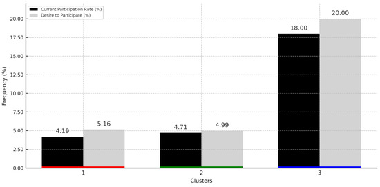 Table 3 presents a detailed breakdown of sports participation characteristics across clusters. Cluster 3 showed significantly higher rates of both current participation (32.46% vs. 22.45% and 19.73%) and desire to participate (31.82% vs. 23.16% and 19.94%) compared to Clusters 1 and 2, respectively (p < 0.001 for both).