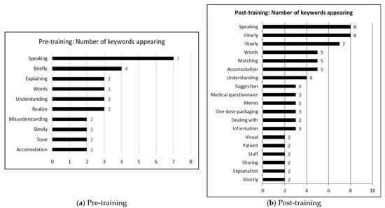 Both before and after training, the most frequently mentioned category was “speaking,” indicating a tendency to focus on communication-related adaptations. After training, new categories that were not present in the pre-training responses appeared, such as “matching,” “medical questionnaire,” and “one-dose packaging.”