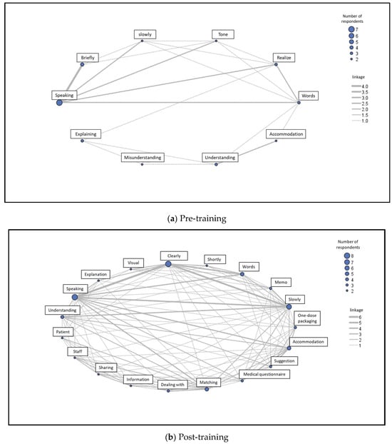 After training, co-occurrence was observed not only between existing categories such as “slowly”—“clearly”—“speaking” and “matching”—“speaking”; but also between new categories introduced after training, such as “accommodation”—“suggestion.” Overall, there was an increase in the number of co-occurrences.