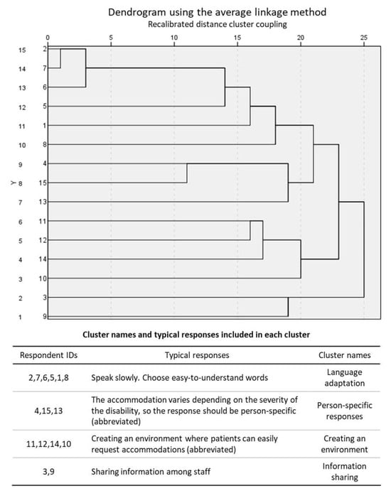 The first cluster included responses related to adapting language based on the person’s level of understanding, such as “Speak slowly. Choose easy-to-understand words,” and was called the “Language adaptation” cluster. The second cluster included responses such as “The accommodation varies depending on the severity of the disability, so the response should be person-specific (abbreviated),” reflecting the idea of avoiding a one-size-fits-all approach to judgment or accommodation. Therefore, this cluster was named “Person-specific responses.” The third cluster included responses related to creating an environment, such as “Creating an environment where people can easily request accommodations (abbreviated),” and was named “Creating an environment.” The fourth cluster included responses such as “(abbreviated) Sharing information among staff” and was named “Information sharing.”