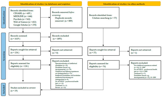The search strategy aimed to identify studies examining ACEs, PCEs, or related constructs in children with intellectual disabilities, focusing on their associations with psychosocial outcomes. A comprehensive, three-step search strategy was employed in this review. An initial limited search was conducted in Google Scholar and CataloguePlus, which searches the collections of the University of Amsterdam (UvA) Library. This preliminary search aimed to identify key studies and relevant literature on the topic, helping to refine and inform the development of the full search strategy for the review. Based on the results of the initial search, a comprehensive search strategy was developed using text words found in the titles and abstracts of relevant articles, along with the index terms used to describe these articles. This strategy was then adapted for each database and information source used in the review (see Supplementary Table S1). The following databases and information sources were searched: PsycInfo (Ovid), MEDLINE (Ovid), CINAHL Plus (EBSCOhost), Web of Science Core Collection, and Google Scholar. For Google Scholar, we first identified the top 100 most cited ACE and PCE articles using Publish or Perish. In addition, we manually screened 160 ACE-related and 110 PCE-related articles directly in Google Scholar to ensure that less-cited but potentially relevant studies were also considered. The lower number of PCE-related articles reflects the limited availability of relevant results during the search process. Citation searching was conducted manually by screening the reference lists of relevant articles, particularly systematic and scoping reviews, as well as other articles that cited primary studies included in this review. Studies published in any language were included to ensure a comprehensive exploration of the literature. The search was conducted without language limitations. Non-English articles were translated using machine translation tools and subsequently assessed for eligibility based on the predefined inclusion criteria. Studies published from 2009 to 8 October 2024 were included, reflecting the emergence of ACEs as a formalized construct in child research around that time [71]. While included studies were not required to explicitly use the terms ACEs or PCEs, inclusion was based on predefined conceptual criteria aligned with these frameworks. This allowed for the inclusion of studies addressing related constructs—such as trauma, early adversity, or resilience—when conceptually consistent with the ACE/PCE paradigm. While earlier studies may have examined similar phenomena under different terms, we prioritized capturing developments aligned with the contemporary conceptualization of ACEs that build upon pre-2009 conceptual foundations. This approach ensured terminological flexibility within a coherent temporal and conceptual scope. Research on PCEs, in particular, has gained significant momentum over the past five years, with most relevant studies published during this period [44,72]. The search strategy, including all identified keywords and index terms, was peer-reviewed by experts in the field to ensure comprehensiveness and accuracy.