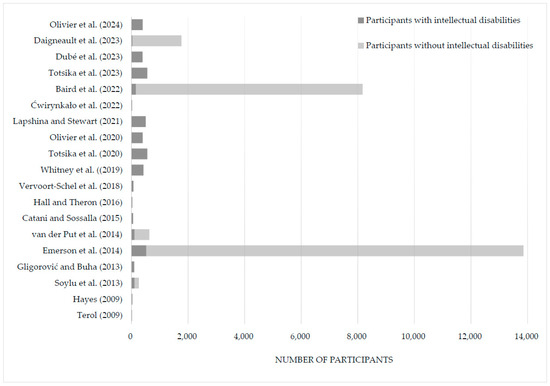The 19 included studies analyzed a combined sample of 28,205 participants, of whom 4424 (15.7%) were identified as having intellectual disabilities. However, as some studies were derived from overlapping datasets, these figures do not necessarily reflect a fully distinct sample. Four studies analyzed data from the UK’s Millennium Cohort Study (MCS) [76,77,80,81], while three relied on a sample of secondary school students from Australia and Canada [78,79,84]. Sample sizes varied substantially, ranging from small cohorts of 15 participants to large population-level datasets exceeding 13,000 participants. The proportion of participants with intellectual disabilities within the studies ranged from 1.8% to studies exclusively focused on intellectual disabilities populations, as illustrated in Figure 2.