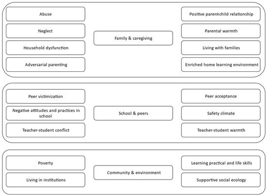The considerable variability in how ACEs and PCEs were conceptualized and measured across studies underscores the complexity of comparing findings and identifying consistent patterns. To illustrate the interconnectedness of these constructs, Figure 3 presents a clustered overview of ACEs and PCEs across three ecological domains: family and caregiving, school and peers, and community and environment. This categorization is informed by a thematic organization of the identified constructs, illustrating how adverse and positive childhood experiences interact across social contexts, shaping psychosocial outcomes in children with intellectual disabilities. The following section examines the extent to which these constructs are associated with psychosocial outcomes, focusing on cumulative risk and resilience processes.