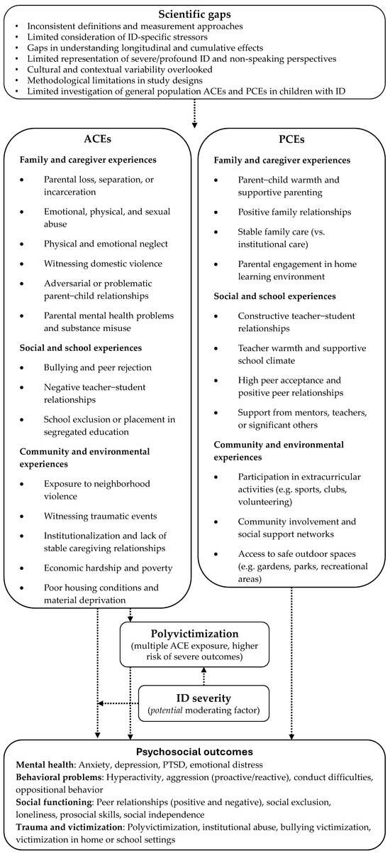 Schematic representation of reported associations among ACEs, PCEs, intellectual disabilities (ID) severity, and psychosocial outcomes in children with intellectual disabilities.