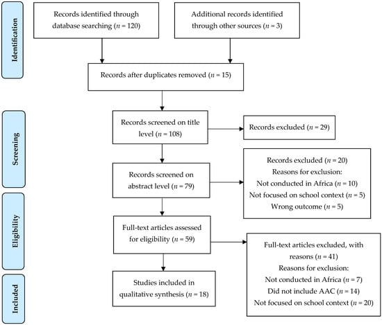 The benefits and the importance of AAC in schools are also recognized by international policy, such as the United Nations Convention on the Rights of Persons with Disabilities (UNCRPD) [16], which emphasizes communication as a basic human right. Articles 8 and 9 of the UNCRPD advocate for freedom of speech and accessibility, while Article 20 stresses the importance of enabling learners with diverse educational needs, full access to information, and the freedom to express themselves [17]. Although these conventions emphasize the rights of persons with disabilities, a paucity of evidence exists on how persons access their rights. This is evident in school contexts where young children and adolescents with disabilities have difficulty communicating and experience challenges with the implementation of AAC in the classroom. This review was undertaken as part of the authors’ 30-year reflection on inclusive education in South Africa. The following research question was formulated: “What are the AAC strategies employed in African schools to facilitate participation for learners with diverse educational needs?” In this study, learners with diverse educational needs include learners who are candidates for AAC.