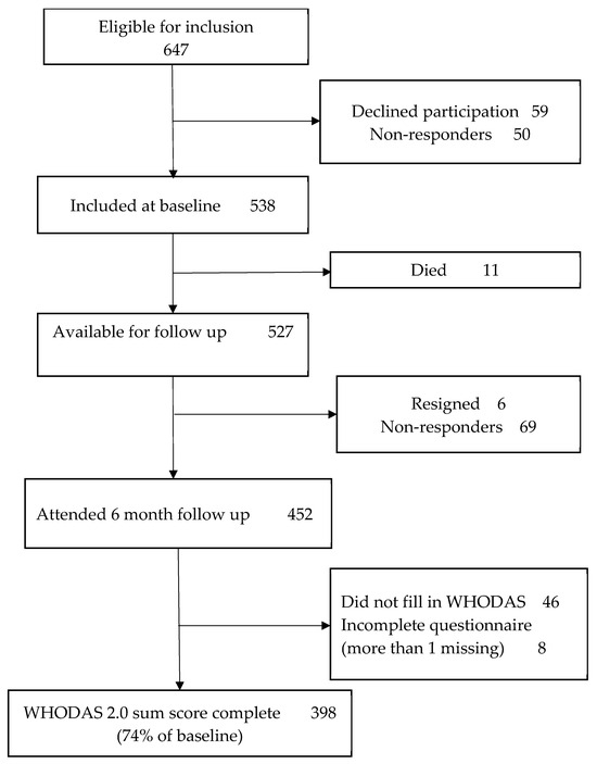 Of the 527 participants eligible for a follow-up at 6 months post-injury (Figure 1), 452 participants attended the 6-month follow-up, and 398 (75.5% of eligible participants) had complete WHODAS 2.0 scores and were included in this study.
