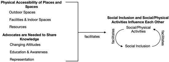 We developed three main themes describing how participants conceptualize social inclusion and participation in social and physical activities: physical accessibility of spaces and places, advocates are needed to share knowledge, and social inclusion and social/physical activities influence each other (Table 2; Figure 1).