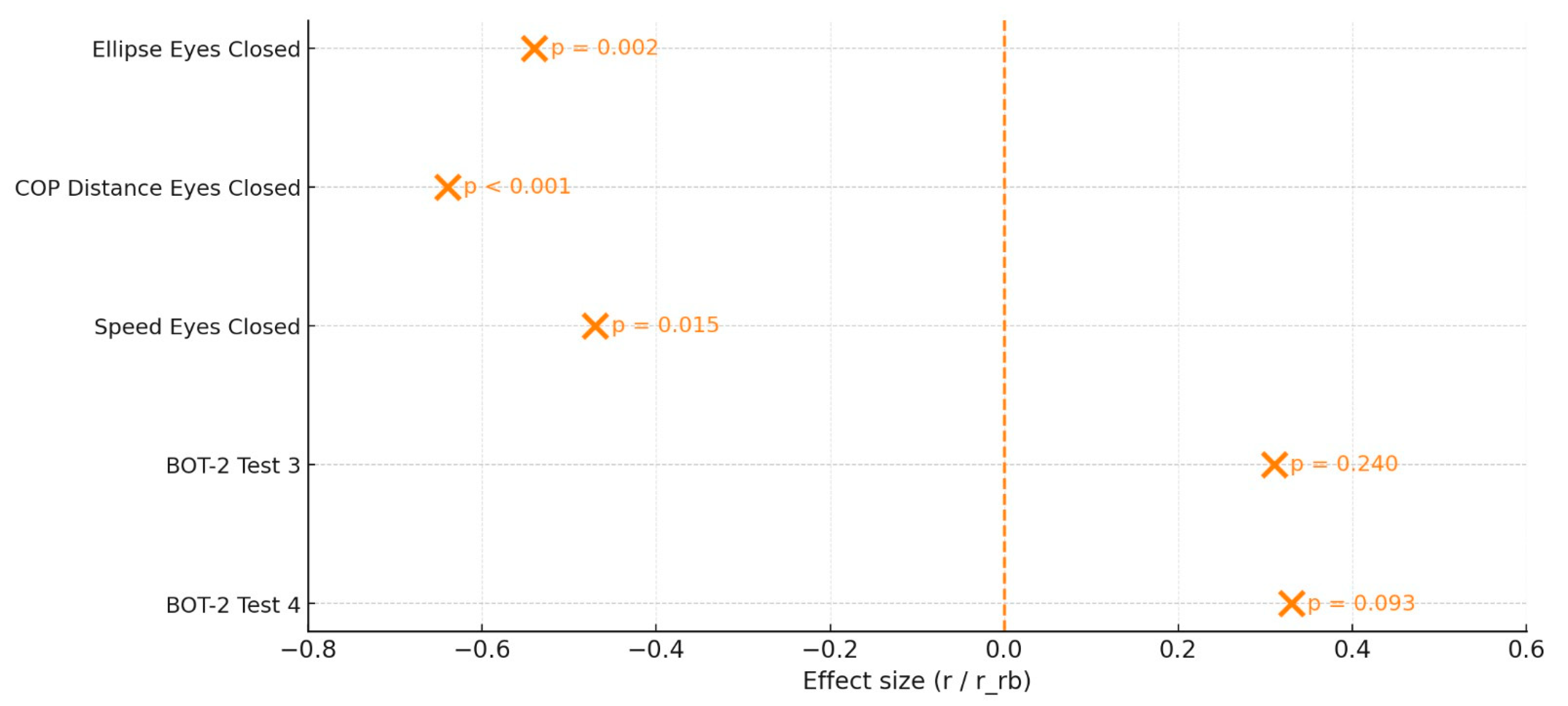 To align with the non-parametric approach, within-group effects are expressed as Rosenthal’s r and between-group effects as rank-biserial r_rb. Effect sizes are signed to indicate the direction of change: for stabilometric variables (where lower values indicate improvement), negative r/r_rb values favor the experimental group; for BOT-2 scores (where higher values indicate improvement), positive r/r_rb values favor the experimental group. Cohen’s d values are provided only in the