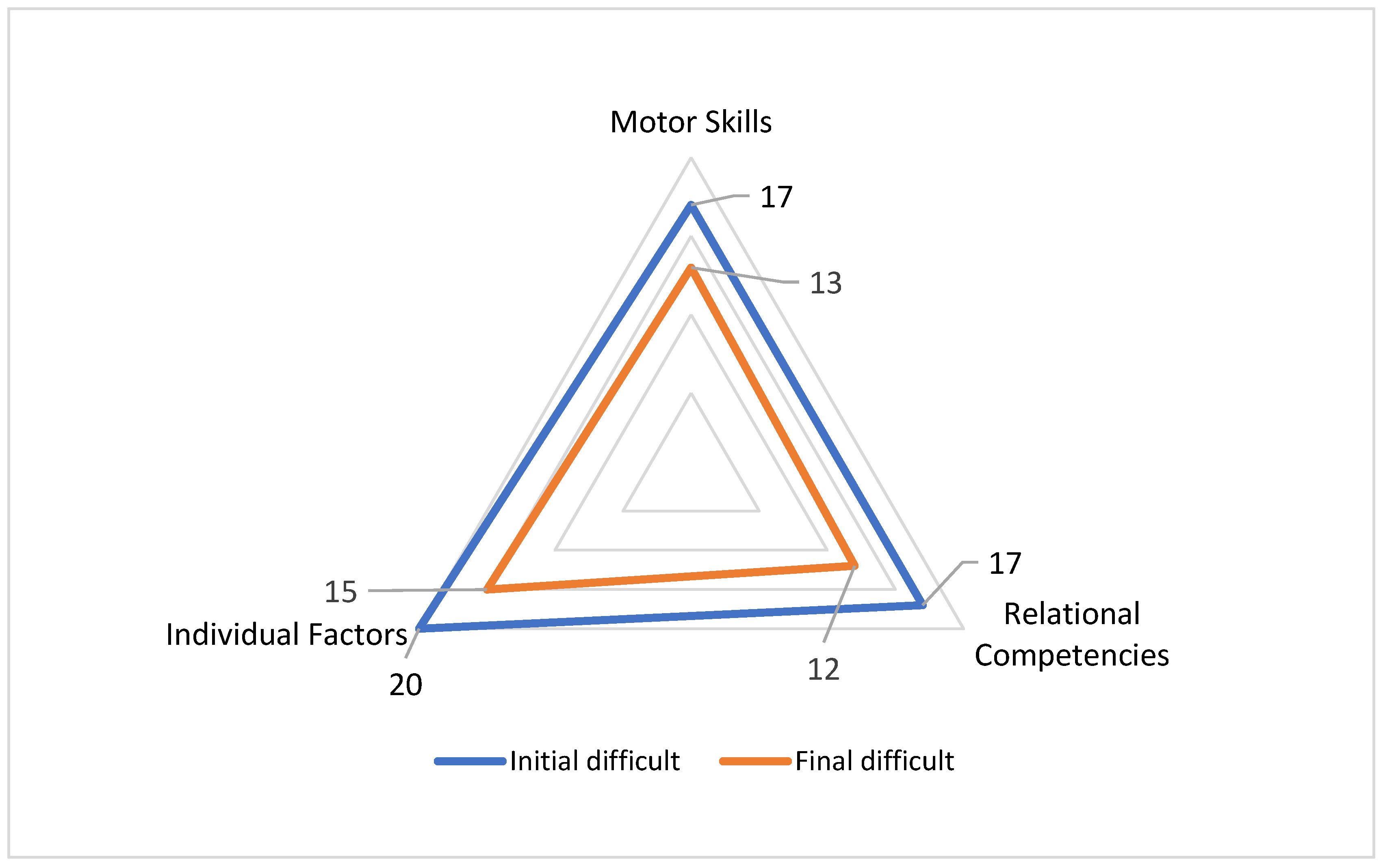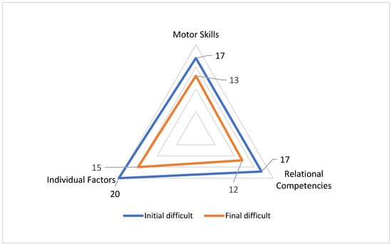 As highlighted in Table 3, the analysis of these indicators reveals that the most consistent improvements concern the psychosocial sphere. Both relational competencies and individual factors show an identical reduction in difficulty of 20.8%, indicating that the program acted in a balanced manner to enhance socio-emotional skills and personal development. The motor domain also shows significant progress, with a 16.6% reduction in initial difficulties. This improvement, although numerically lower, remains substantial and demonstrates the effectiveness of structured sports activity in promoting physical development alongside psychosocial growth. This descriptive analysis was considered appropriate for the main objective of the study, which was to evaluate the feasibility and to generate preliminary evidence, rather than to test hypotheses.
