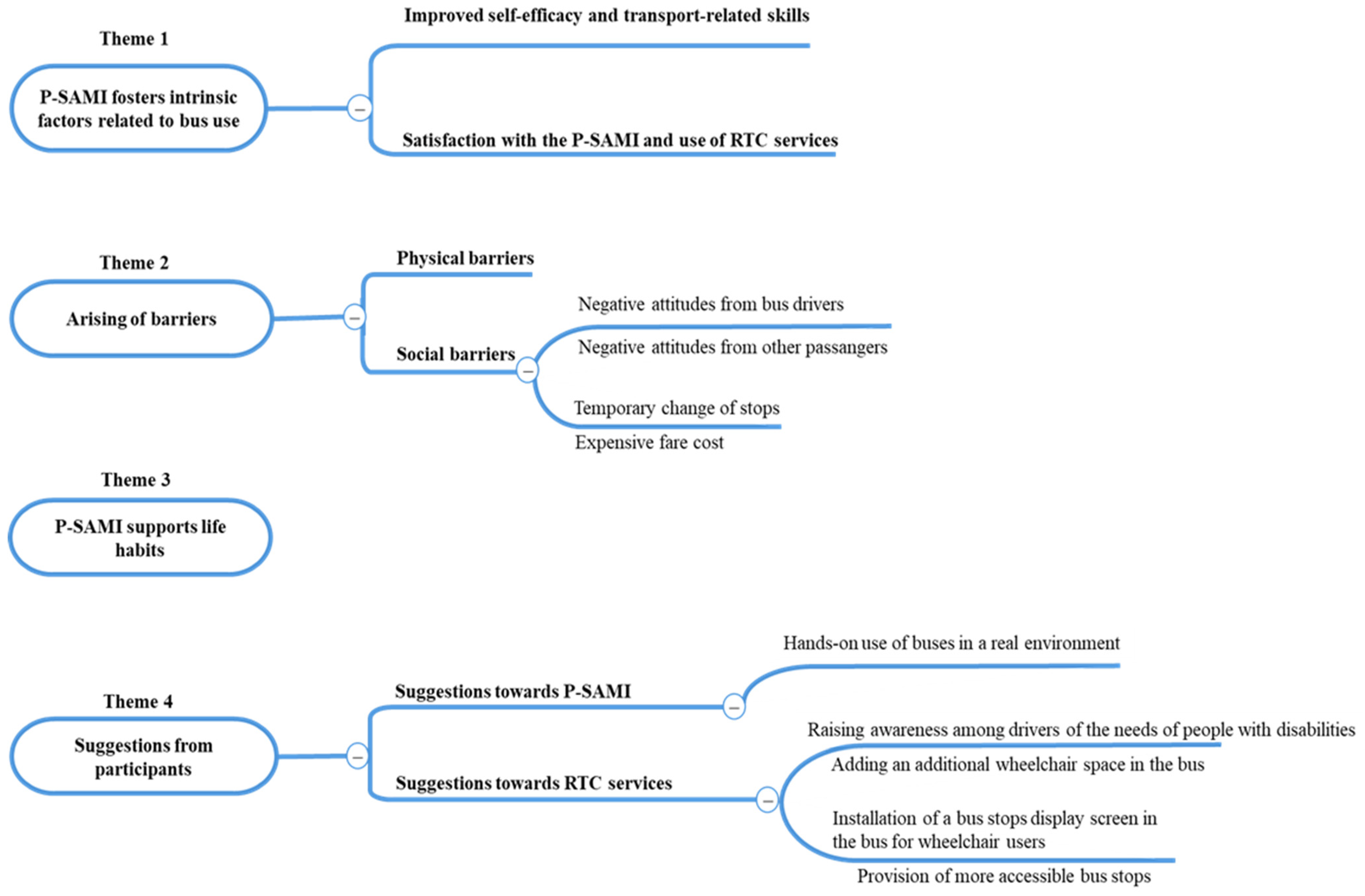 | Satisfaction | COPM scores (mean ± SD) before versus after P-SAMI indicated statistically significant difference (p < 0.01) | “I’m Um, I’m very satisfied. It’s going well overall. And I can find my seat pretty easily. And my trip is going pretty well. I have, I have, um, as much as the drivers are willing to help me, the passengers are also willing to help me, whether it’s to change buses, to transfer, or sometimes to find the stop if I’m not quite at the stop. I ask to find out how long it will be before the bus arrives. And especially the new app, it makes it much easier for me to use. The voice that announces the stops is also there.” (A man with visual disability; 58-year-old) | Convergence: Both results demonstrated improvements or a high level of satisfaction with bus use among people with disabilities after P-SAMI. |