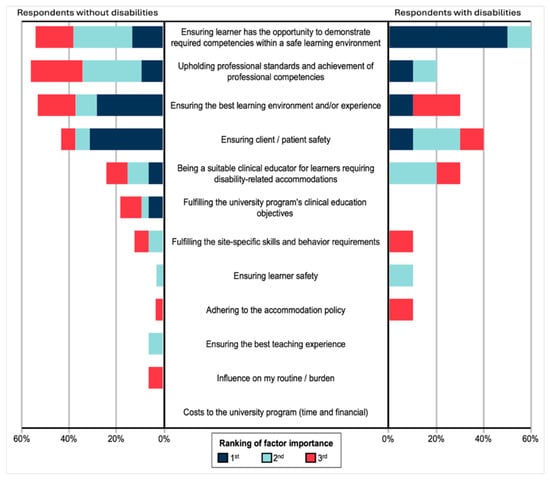 To identify if there were any differences in the answers of respondents living with disabilities compared to those not living with disabilities, their answers were extracted separately and compared. Figure 1 depicts the factors that respondents ranked as most important when implementing disability-related accommodations. Both disabled and nondisabled respondents ranked “ensuring client/patient safety” as the second most important factor (overall score = 0.80 and 1.13, respectively). However, respondents living with disabilities ranked “ensuring student has opportunity to demonstrate required competencies within a safe learning environment” highest (overall score = 1.70) and respondents not living with disabilities ranked “ensuring the best learning environment and/or experience” highest (overall score = 1.19). Thus, disabled respondents emphasized a barrier-free and safe environment for students in their work as fieldwork educators. Numerical differences could not be compared as no statistical test exists to compare ranked items.