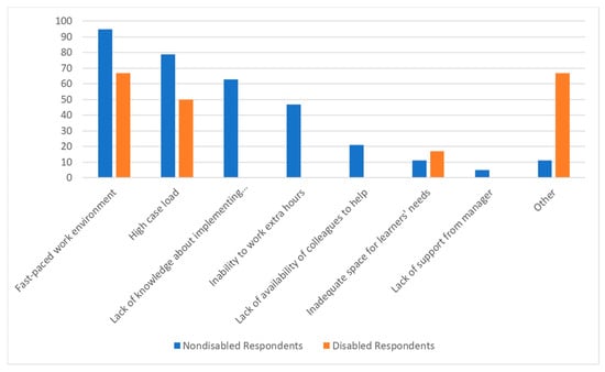 Our survey results demonstrated a dominance of time-based accommodations, such as more time for tasks, time away from fieldwork, scheduling changes, etc. Time-based accommodations have been cited as a frequent and reasonable accommodation in other HPP studies [12,14]. As the priority, accommodations must reduce barriers to student learning. In this survey, responses provided in the “other” category of accommodations that fieldwork supervisors were asked to implement were uncommon but more complex and time-consuming to implement; these included selective patient assignment and hands-on skills support outside of the fieldwork setting. While complex accommodations may involve more resources, they are likely to set students up to succeed in fieldwork and their future practice.