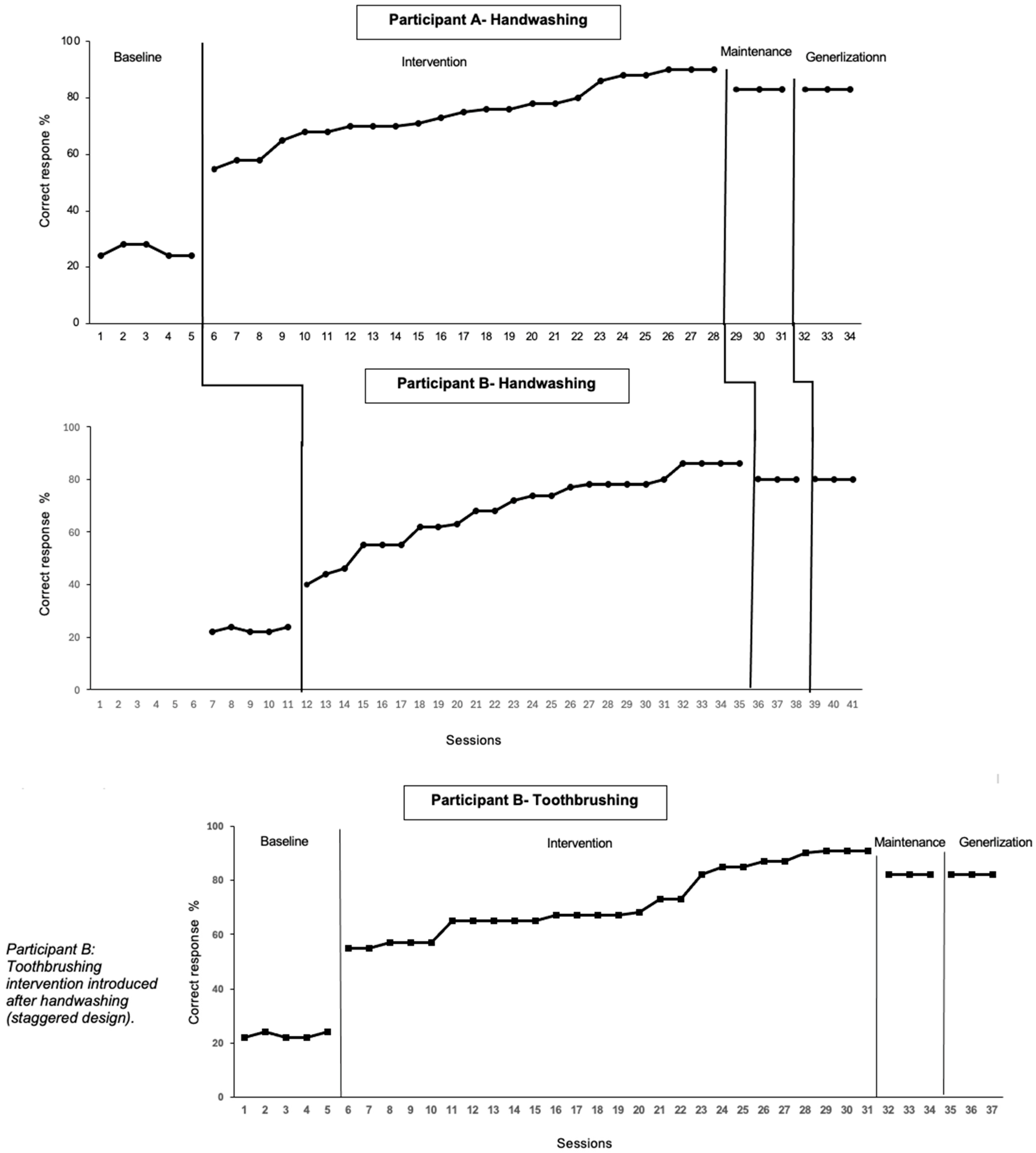 34] was employed to examine the effectiveness of the intervention. The study aimed to examine changes in personal hygiene performance associated with the implementation of an intervention package consisting of video prompting, task analysis, error correction procedures, and putative reinforcement. To structure a staggered introduction of the intervention, implementation for Participant B occurred only after Participant A showed improvement in handwashing performance. Additionally, toothbrushing for Participant B was introduced as a second skill only after satisfactory mastery of handwashing, creating a multiple baseline across behaviors. This design allowed for visual examination of whether changes in performance systematically followed intervention introduction across participants and skills [
