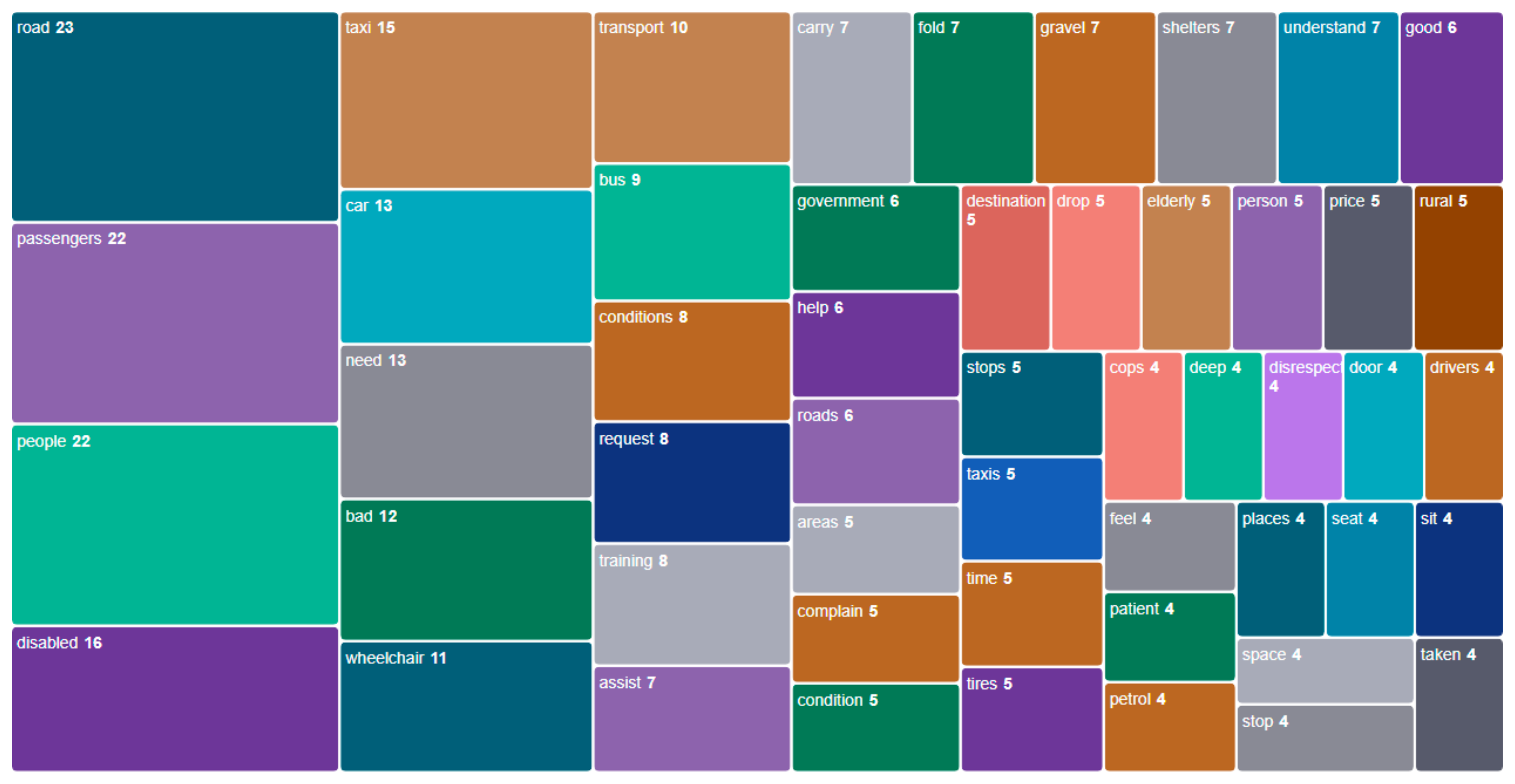 This section presents the key findings from interviews conducted with minibus taxi drivers operating in rural areas of South Africa, focusing on their experiences transporting passengers with disabilities. A treemap shown as