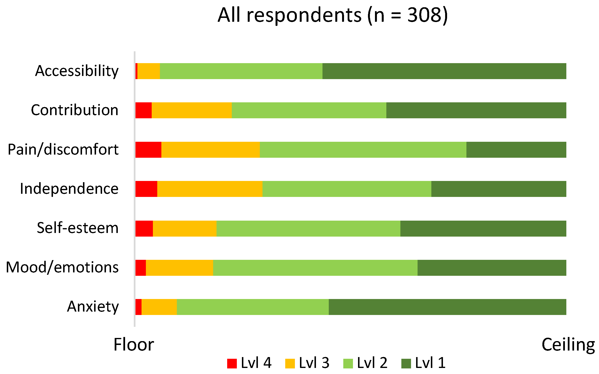 - Self-esteem: 16.6% (n = 51) experienced negative impacts on their feelings of emotional health and happiness relating to their assistive technology use, compared to 72.4% (n = 223) who experienced positive impacts.