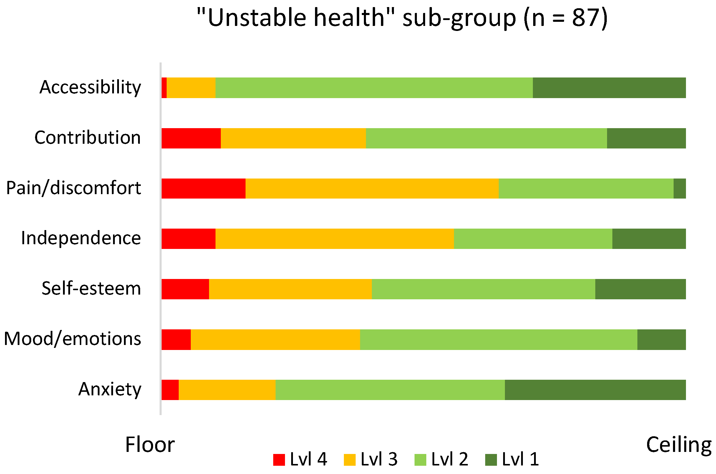 | Mobility | Self-Care | Usual Activities | Pain/ Discomfort | Anxiety/ Depression | Feeling Settled and Secure | Love, Friendship and Support | Being Independent | Achievement and Progress | Enjoyment and Pleasure | ||