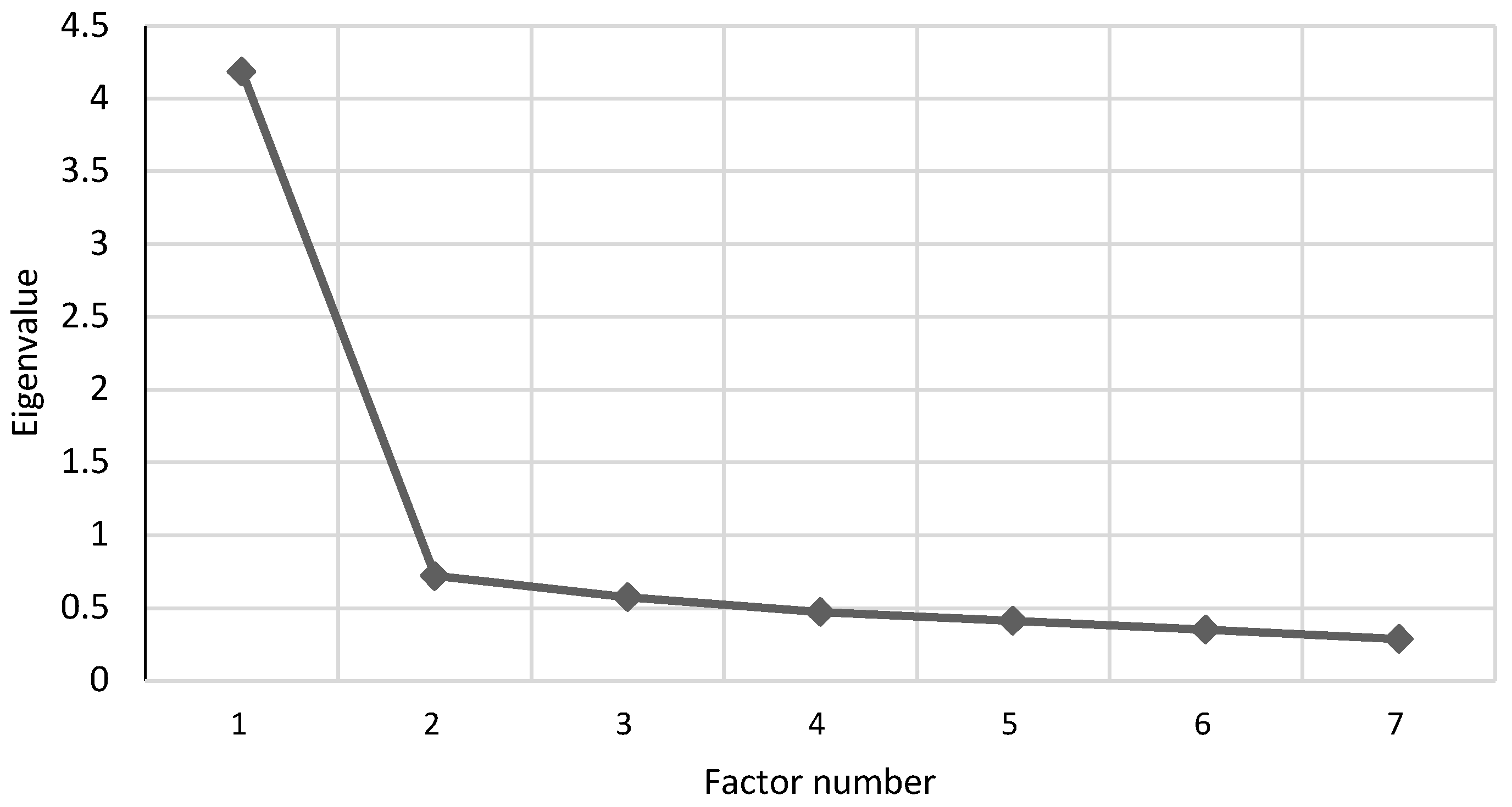 - Exploratory factor analysis (EFA): As the MobQoL-7D Dutch is a novel PROM translation, EFA was undertaken to examine the inter-relationship between items and underlying factorial structure [32]. Due to the ordinal nature of the 4-point Likert-type scale utilised in the MobQoL-7D Dutch, EFA was performed using Principal Axis Factoring and with polychoric correlation. Rotation was not required, as only one factor was identified. Sampling adequacy was assessed using the Kaiser–Meyer–Olkin (KMO) test (KMO ≥ 0.90 indicates excellent sample adequacy), and Bartlett’s test of sphericity was used to test the adequacy of correlations between items (p < 0.05 confirms data suitability for EFA) [33]. The number of independent factors was determined by eigenvalues ≥ 1 [33] and interpretation of the screeplot. As per COSMIN guidance, relevant fit indices included factor loadings for each item and variance across the items explained by the identified factor (COSMIN thresholds: factor loadings ≥ 0.30 per item and explained variance ≥ 50%, respectively) [29].