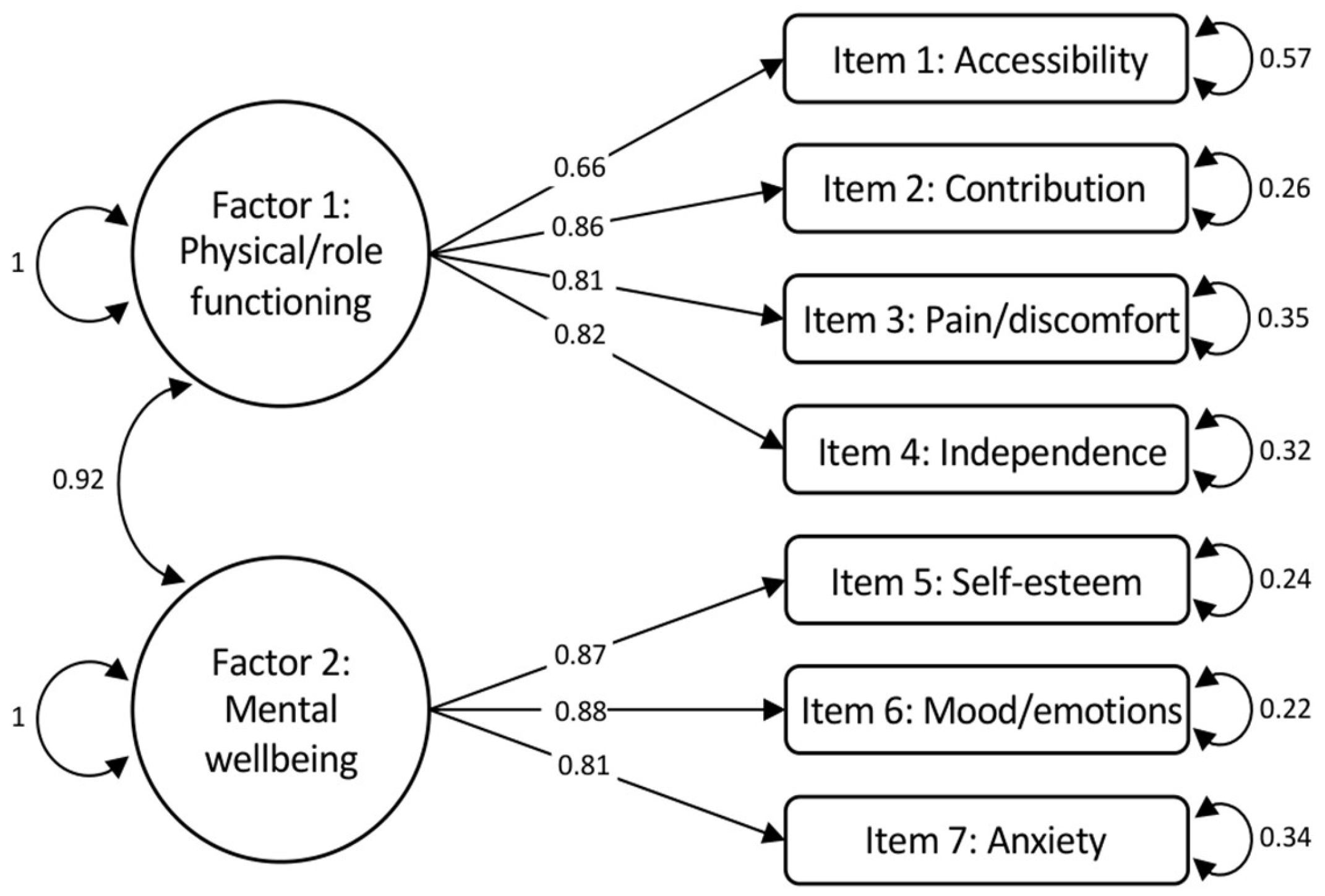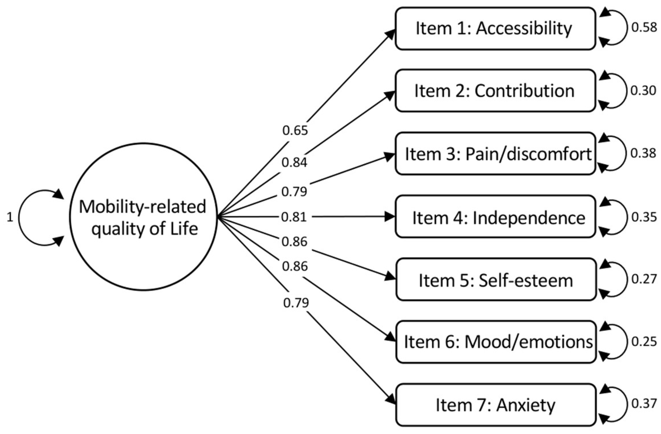 - Confirmatory factor analysis (CFA): This was undertaken to further validate the factorial structure identified by the EFA and to also examine potential factorial fit with the two-factor structure of the original MobQoL-7D (factor 1: physical/role function related to mobility; and factor 2: mental well-being related to mobility). The CFA models were estimated using weighted least square mean and variance (WLSMV), which is considered most appropriate for ordinal data (e.g., Likert scales) [34]. A range of model fit statistics were examined using the following minimum thresholds defined by COSMIN: Comparative Fit Index (CFI) > 0.95; Tucker–Lewis Index (TLI) > 0.95; Root Mean Square Error of Approximation (RMSEA) < 0.06; and Standardised Root Mean Square Residual (SRMR) < 0.08 [29]. Standardised factor loadings for each item were also evaluated, with a desired minimum loading of ≥0.50 per item.
