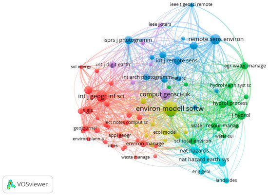 Figure 2 shows a network of co-citation regarding the journals present in the WoS database. In the network, each circle represents a different journal, with the larger circles having the highest number of citations in the GIS open-source software domain and the lines corresponding to the link strength between the different sources.