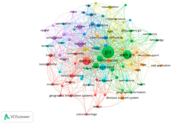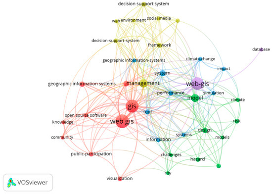 Figure 5 shows that “web gis”, “gis” and “web-gis” are the most used keywords. Other words can also be observed: “management”, “climate-change”, “system”, “model”, “information”, “geographic information systems”, etc. In addition, the term co-occurrences network map was created (Figure 6).