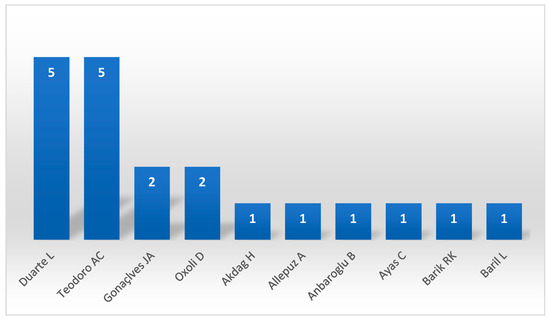 The number of occurrences of publications based on GIS open-source applications in the 10-year period, by author.