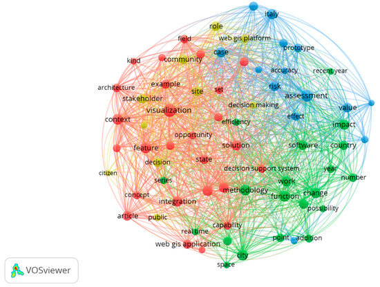 The different colors represent the groups of related terms. In this case, the red group represents terms related to visualization, opportunity, architecture, integration and concept. These terms can be related to the development of applications and web services. The green group represents terms related to software, impact, efficiency, methodology, etc., being terms related to software. The blue group represents terms such as assessment, accuracy, risk and effect, more related to environmental issues. The yellow group is related to decision making, community, etc., more related to the platforms and applications that are open source and thus are developed by collaboration. It can be verified that the red, green and blue groups present the strongest terms, meaning that the building of web applications or web GIS has a strong relationship with environmental applications. From the results in Figure 5 and Figure 6, it is possible to conclude that web GIS applications have been used in a wide variety of research areas including environmental sciences.