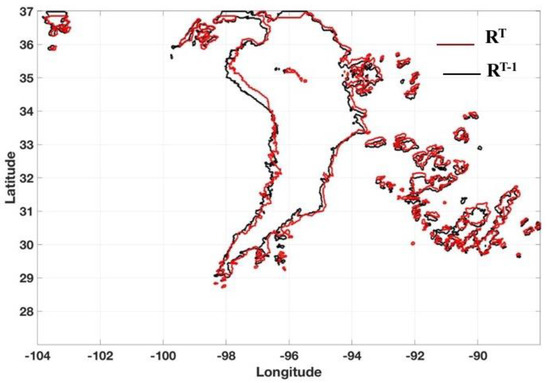 The contours of the rainfall rate (R) fields. The segmentations of R at 2210 UTC (RT) and 10 min prior () are represented by red and black lines, respectively.