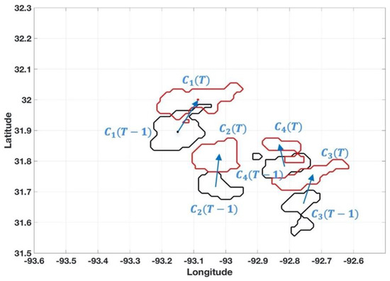 The centroid of each segment is then calculated with a K-mean method [29,30]. An enlarged area including four precipitation segments is shown in Figure 5, where red and blue colors are used to indicate cells/segments from T and , respectively. The displacement of each segment is determined through a matching process. Within a maximum travel distance, the matching pairs (e.g., C1() and C1()) from the moment and T are associates with a short distance; similar characteristics are found in the storm size and water content (Dixon and Wiener 1993). For example, if there are total and cells identified from and T, there are possible counterparts at T for the cell (center at (, )) at .
