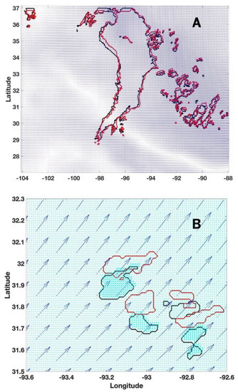 The wind field from the RAP model, an hourly updated assimilation and model forecast system, is used as another input to this algorithm. The RAP model produces horizontal wind components along longitude (U) and latitude (V) directions with a spatial resolution of 10 km by 10 km and a temporal resolution of 1 h. The RAP was implemented as an operational forecast system at the NOAA/National Centers for Environmental Prediction (NCEP) in 2012 [31]. Two layers of data are available at 700 hPa and 850 hPa reference levels. Figure 6A shows an example of the RAP model wind field from an 850 hPa layer at 2200 UTC on 25 May 2015, where the spatial resolution is 10 by 10 km.