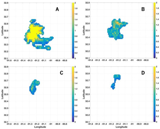 Example of one precipitation segment at (A) , (B) , (C) , and (D) T.