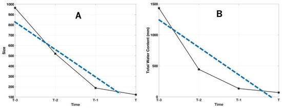 The trend of (A) the precipitation’s size and (B) the precipitation’s total water content. The calculated variables are presented with solid black lines, and linearly fitted results are shown with dashed blue lines.