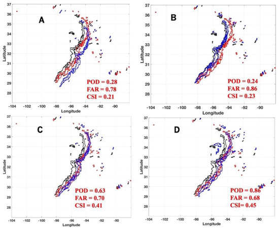 Hurricane Harvey brought significant precipitation to Texas in August 2017, causing catastrophic flooding and more than 100 deaths. It was considered the most powerful tropical cyclone rainfall event in the United States regarding its scope and peak rainfall amounts. In the current work, the performances of these three approaches were evaluated using 48 h of mosaicked radar data (28–29 August 2017). The obtained POD (A), FAR (B), and CSI (C) are shown in Figure 11, where the red, blue, and black lines indicate the results from the proposed, the centroid-tracking, and the model approach, respectively. During the 48 h, the proposed approach showed its superiorities to all three scores and produced a continuously higher POD, lower FAR, and higher CSI during the whole period. Compared with the model and centroid-tracking approaches, the average POD of the proposed approach improved about 16% and 44%; the average CSI improved 13% and 37%, and the average FAR decreased about 12% and 18%, respectively.