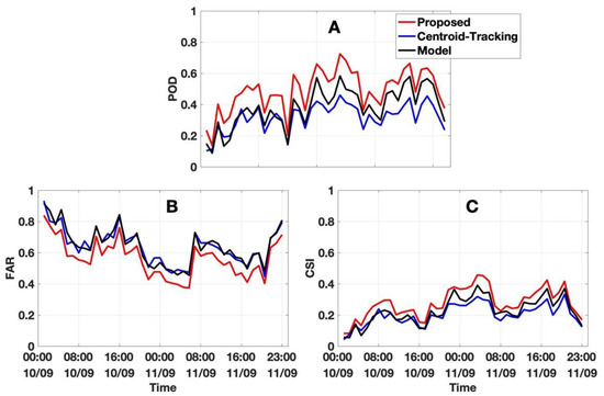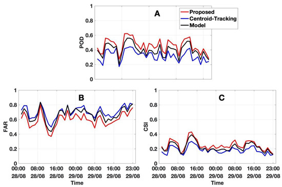 The statistical score of (A) the probability of detection, (B) the false alarm rate, and (C) the critical success index. The red, blue, and black lines show the proposed, the centroid-tracking, and the model results. A set of 48 h of data from 28–29 August 2017 is used in the analysis.