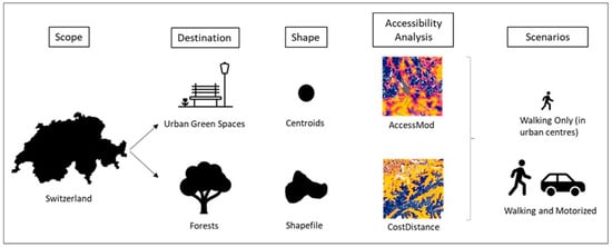 Most of the studies focusing on the modelling of physical accessibility to public green spaces have been carried out at the scale of large cities [,,,]. To the best of our knowledge, no study has yet modelled physical accessibility to public green spaces on a national scale. The aim of this study is therefore to establish the physical accessibility of public green spaces by modelling access to both forests and UGS at the national and sub-national scales of Switzerland. We extend and develop the methodology proposed by [] by using various geospatial tools to model accessibility in a realistic way yet accounting for the current limitations of these tools.