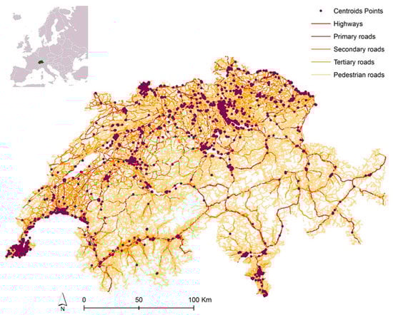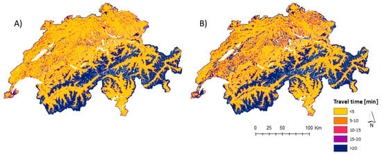 For the walking speeds, we assumed an average speed of 5 km/h on flat ground, and a reduced walking speed of 2 km/h on agricultural lands and other natural elements []. Speeds on roads were assigned the official maximum driving speeds in Switzerland.