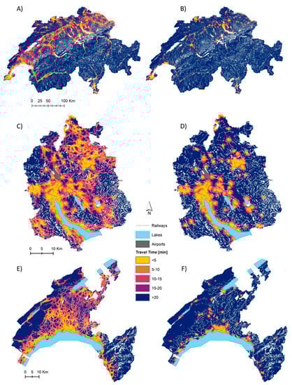Travel time to reach centroids of urban green spaces, using a walking and motorized model: (A) nationally, (C) for the canton of Zurich, (E) for the canton of Vaud; and using a walking-only model: (B) nationally, (D) for the canton of Zurich, (F) for the canton of Vaud.