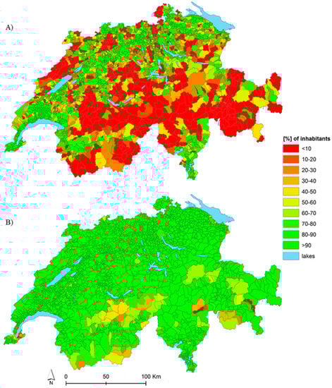 We also obtained population coverages and maps at the municipal level (Figure 5). The percentage of inhabitants with good access to public parks seems to be mainly concentrated in urban municipalities, or on the lowlands (Figure 5A). Conversely, rural, or mountainous municipalities lack accessibility to public green parks, which is mainly due to the small number of parks in these areas. The Swiss population has good access to forests within 15 min travel time, even at the municipal level (Figure 5B). The few municipalities that stand out as having low access to forests are in cold, mountainous regions.
