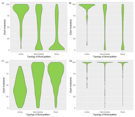 To further analyze the relationship between the physical accessibility to UGS and the degree of urbanization of the municipality level, we made use of the official urban typology of municipalities in three categories: “Urban”, “Intermediate”, “Rural”. The distribution of the population coverages over the municipalities falling within each urban category is depicted as violin plots in Figure 6, for both access to UGS and access to forests, following a walking and motorized travel model. Urban green spaces, which are mostly located within cities, provide easy access (within 10 min) to a large proportion of the population in most urban municipalities (Figure 6A). Intermediate and rural municipalities mostly have a relatively lower percentage of population with easy access to UGS, even within 15 min (Figure 6B). Conversely, most intermediate and rural municipalities have a large percentage of the population with timely access to a forest in 5 min (Figure 6C), which is not the case for urban municipalities. However, by increasing the travel time to 15 min (Figure 6D), then the vast majority of the municipalities have a very high percentage of their population that can access the nearest forest within that timeframe.