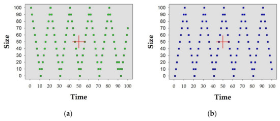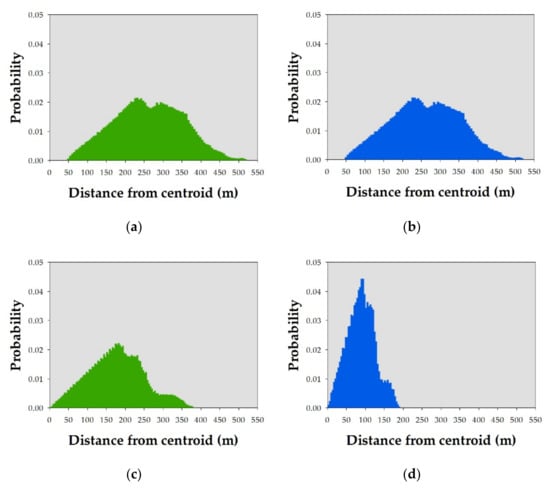 In terms of sensibility, we demonstrated that our method could measure at a human visual level of sensing two pairs of hypothetical patterns (Figure 5), showing reasonable results (Figure 9 and Figure 10 and Table 2). As we described previously in the Methods section, we used two geometric features of point patterns—the distance and angle from the centroid to each point within the extent. For further studies, other geometric features (e.g., the square root of the area of the triangle between three random points from the centroid [27]) may be explored.