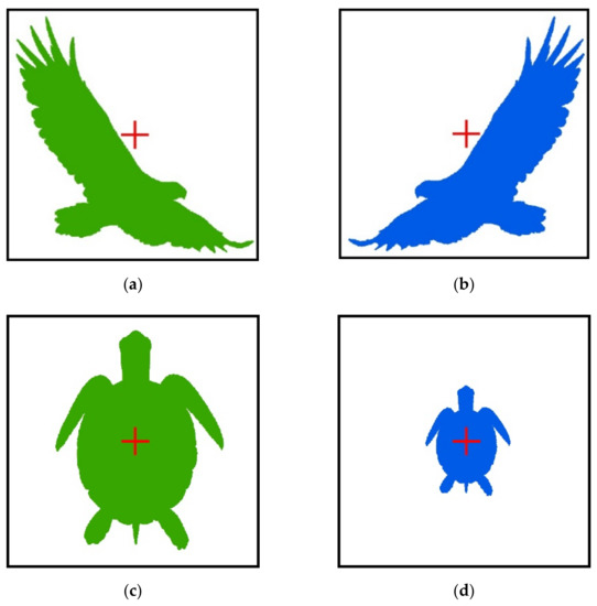 Two pairs of hypothetical spatial patterns were used to evaluate the method in terms of its sensibility (Figure 5). The first pair was two images of mirrored eagles with the same size and pattern. The second pair was two images of turtles, having the same pattern but different sizes. All four images were located within the same extent at the centered position, converted into point data sets, and projected using the WGS 1984 World Mercator coordinate system. It is visually obvious that both the eagle and turtle pairs had different spatial distributions across their respective extent. However, concerning the geometric features used in this study—namely, the distance (δ) and angle (θ) from the centroid to each point within each pair—it is also visually obvious that the eagle pair should have a relatively high PDF similarity of δ but relatively low PDF similarity of θ, and vice versa for the turtle pair. Thus, using these hypothetical patterns, we evaluated the method with regard to how it was capable of measuring their spatial pattern similarities, compared to the human visual sense.