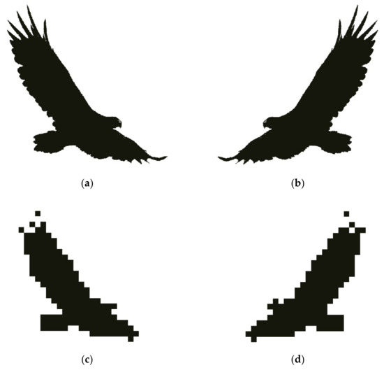 A pair of hypothetical mirrored eagle patterns at original resolution (a,b) and their resampled patterns at a 20× coarser resolution (c,d). These hypothetical data sets were used to evaluate the method in terms of its sensitivity to changes in resolution.