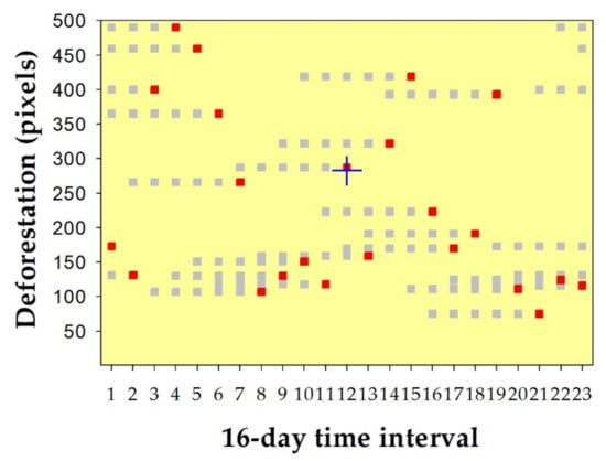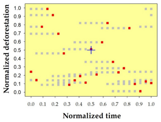 A hypothetical reference deforestation time-series (red squares) was shifted to the left from 16 days to 80 days (grey squares)—representing an acceleration of detection—to perform sensitivity analyses of the proposed method in terms of its robustness to measure the similarity of temporal patterns. The blue cross is the centroid of the graph.