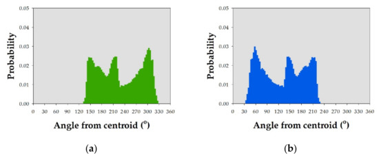 The PDFs of angle from the centroid to each point (θ) for each pair of hypothetical patterns shown in Figure 5 clearly indicate that pair of eagle patterns had contrasting θ PDFs, while the pair of turtle patterns had exactly similar θ PDFs (Figure 9). On the other hand, Figure 10 shows that the pair of eagle patterns had exactly similar δ PDFs, while the pair of turtle patterns had contrasting δ PDFs.